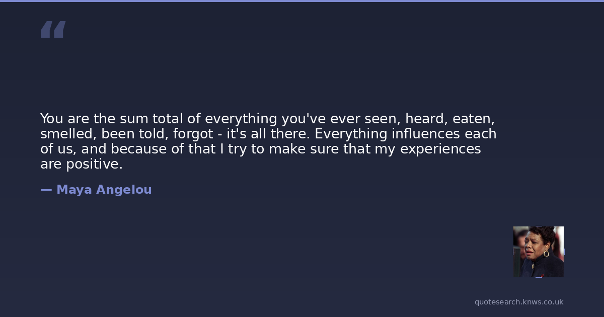 You are the sum total of everything you've ever seen, heard, eaten, smelled, been told, forgot - it's all there. Everything influences each of us, and because of that I try to make sure that my experiences are positive.