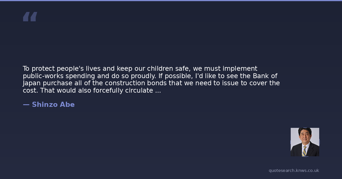 To protect people's lives and keep our children safe, we must implement public-works spending and do so proudly. If possible, I'd like to see the Bank of Japan purchase all of the construction bonds that we need to issue to cover the cost. That would also forcefully circulate money in the market. That would be positive for the economy, too.