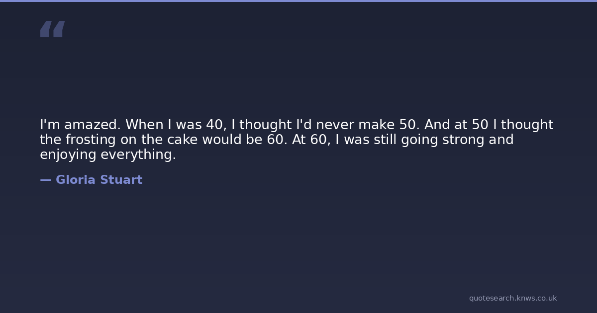 I'm amazed. When I was 40, I thought I'd never make 50. And at 50 I thought the frosting on the cake would be 60. At 60, I was still going strong and enjoying everything.