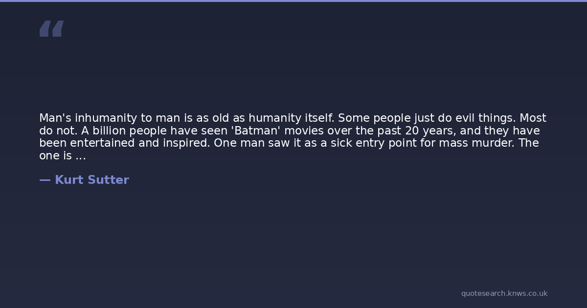Man's inhumanity to man is as old as humanity itself. Some people just do evil things. Most do not. A billion people have seen 'Batman' movies over the past 20 years, and they have been entertained and inspired. One man saw it as a sick entry point for mass murder. The one is tragic. The billion are not. I choose to write for the billion.