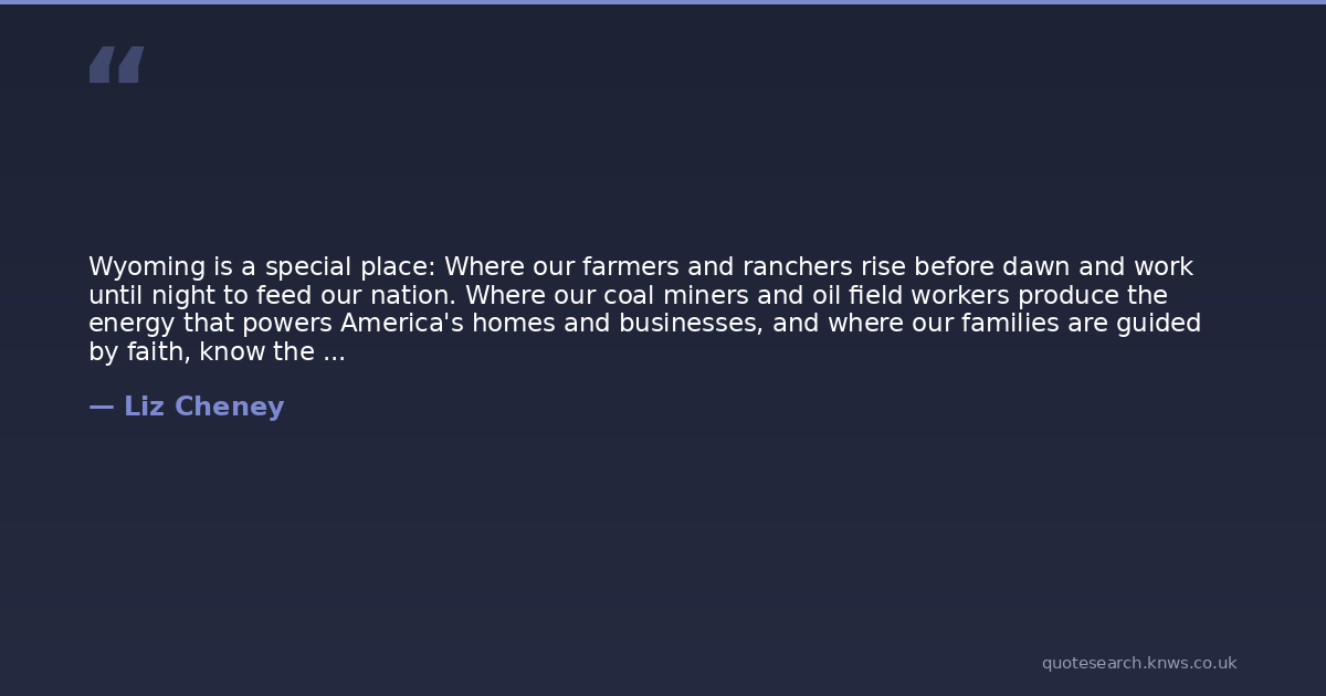 Wyoming is a special place: Where our farmers and ranchers rise before dawn and work until night to feed our nation. Where our coal miners and oil field workers produce the energy that powers America's homes and businesses, and where our families are guided by faith, know the value of hard work, and deeply love our land.