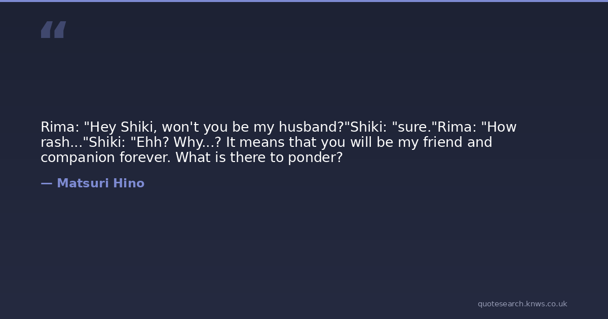 Rima: "Hey Shiki, won't you be my husband?"Shiki: "sure."Rima: "How rash..."Shiki: "Ehh? Why...? It means that you will be my friend and companion forever. What is there to ponder?