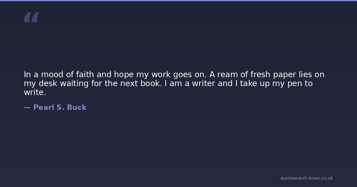 In a mood of faith and hope my work goes on. A ream of fresh paper lies on my desk waiting for the next book. I am a writer and I take up my pen to write.