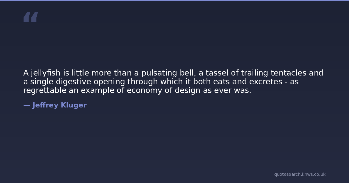 A jellyfish is little more than a pulsating bell, a tassel of trailing tentacles and a single digestive opening through which it both eats and excretes - as regrettable an example of economy of design as ever was.