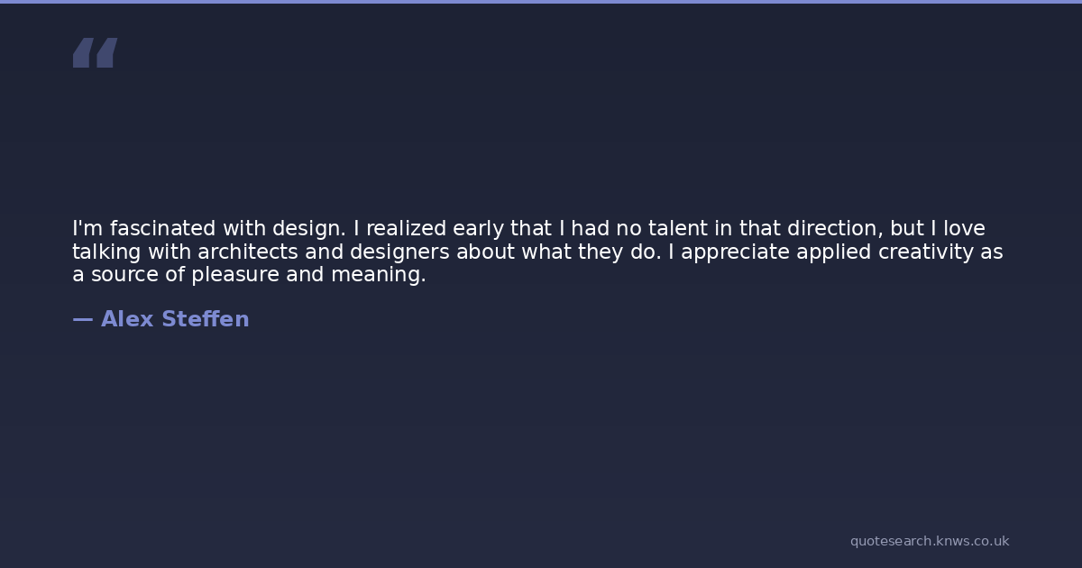 I'm fascinated with design. I realized early that I had no talent in that direction, but I love talking with architects and designers about what they do. I appreciate applied creativity as a source of pleasure and meaning.