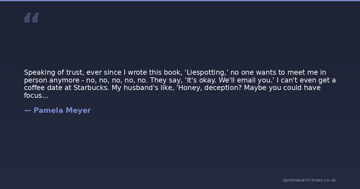 Speaking of trust, ever since I wrote this book, 'Liespotting,' no one wants to meet me in person anymore - no, no, no, no, no. They say, 'It's okay. We'll email you.' I can't even get a coffee date at Starbucks. My husband's like, 'Honey, deception? Maybe you could have focused on cooking. How about French cooking?'
