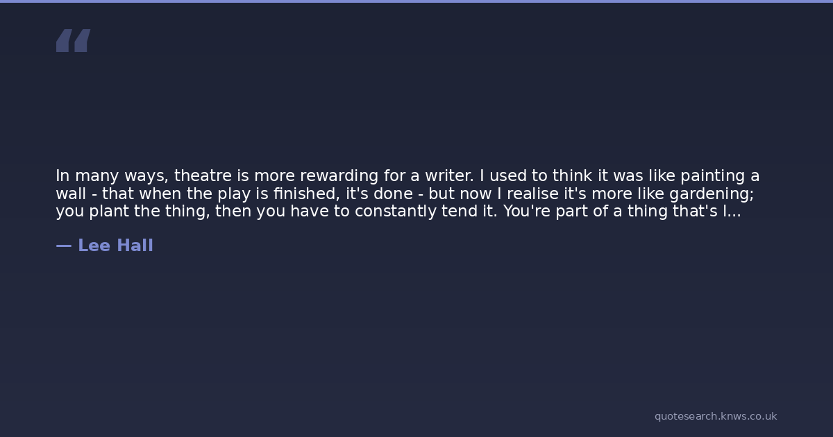 In many ways, theatre is more rewarding for a writer. I used to think it was like painting a wall - that when the play is finished, it's done - but now I realise it's more like gardening; you plant the thing, then you have to constantly tend it. You're part of a thing that's living.