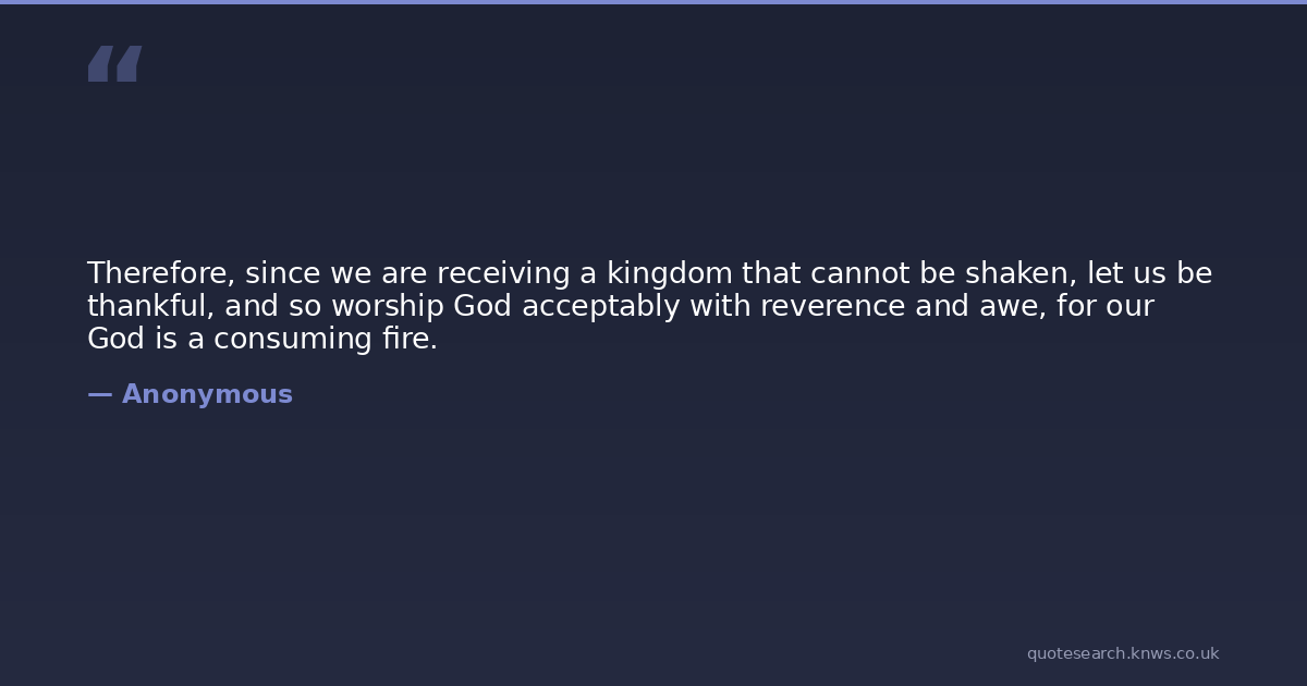 Therefore, since we are receiving a kingdom that cannot be shaken, let us be thankful, and so worship God acceptably with reverence and awe, for our God is a consuming fire.