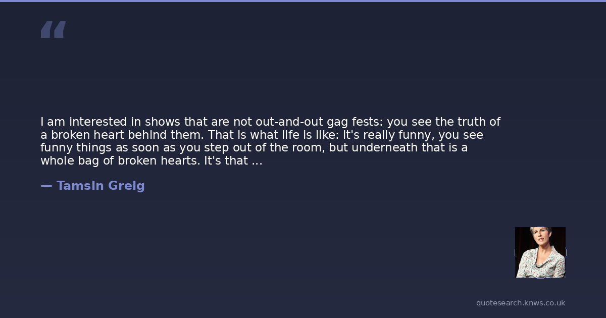 I am interested in shows that are not out-and-out gag fests: you see the truth of a broken heart behind them. That is what life is like: it's really funny, you see funny things as soon as you step out of the room, but underneath that is a whole bag of broken hearts. It's that real pain and that real hilarity that makes life so intriguing.