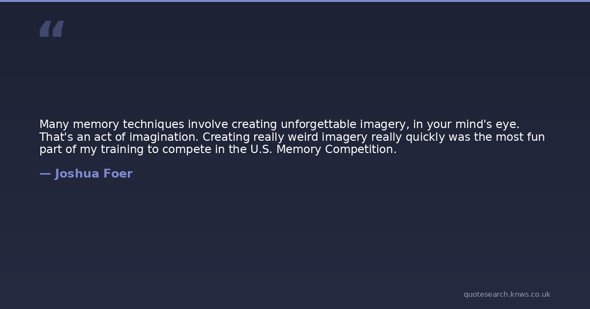 Many memory techniques involve creating unforgettable imagery, in your mind's eye. That's an act of imagination. Creating really weird imagery really quickly was the most fun part of my training to compete in the U.S. Memory Competition.
