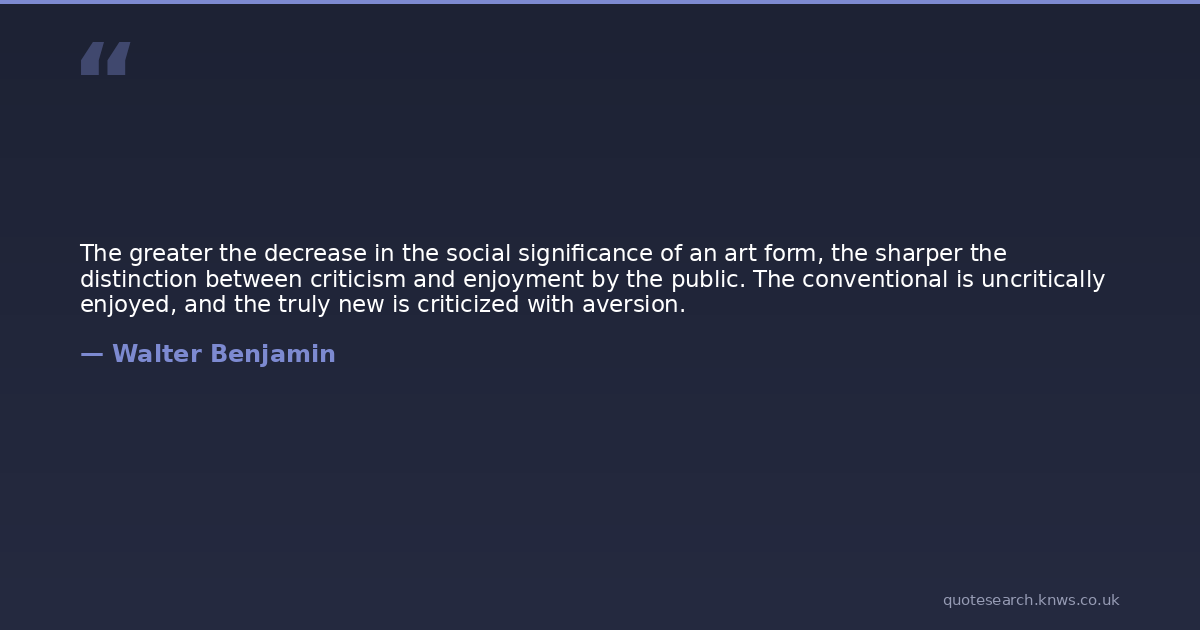 The greater the decrease in the social significance of an art form, the sharper the distinction between criticism and enjoyment by the public. The conventional is uncritically enjoyed, and the truly new is criticized with aversion.