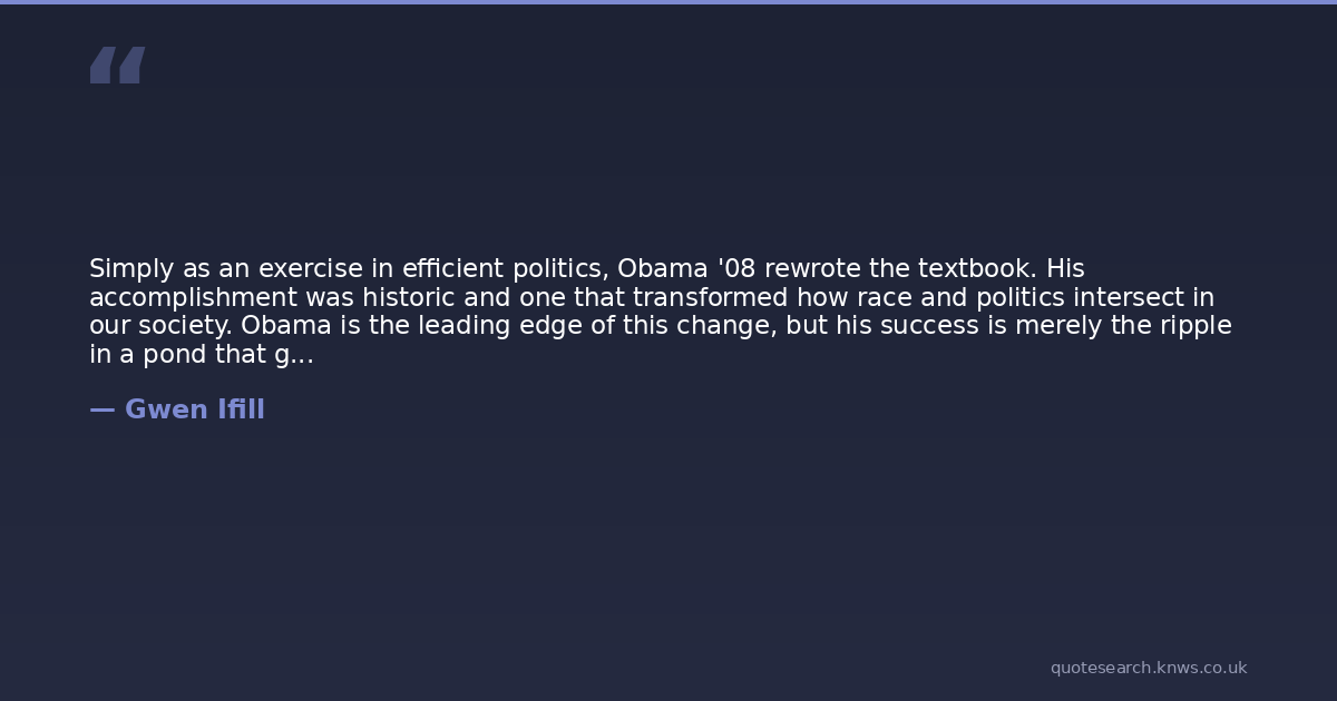 Simply as an exercise in efficient politics, Obama '08 rewrote the textbook. His accomplishment was historic and one that transformed how race and politics intersect in our society. Obama is the leading edge of this change, but his success is merely the ripple in a pond that grows deeper every day.
