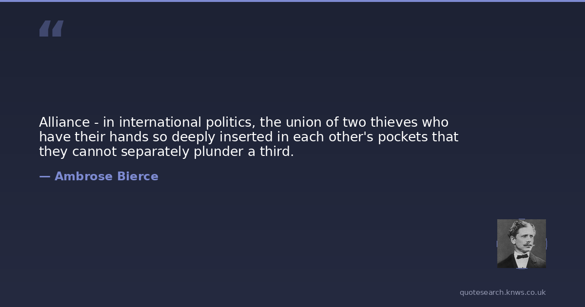 Alliance - in international politics, the union of two thieves who have their hands so deeply inserted in each other's pockets that they cannot separately plunder a third.