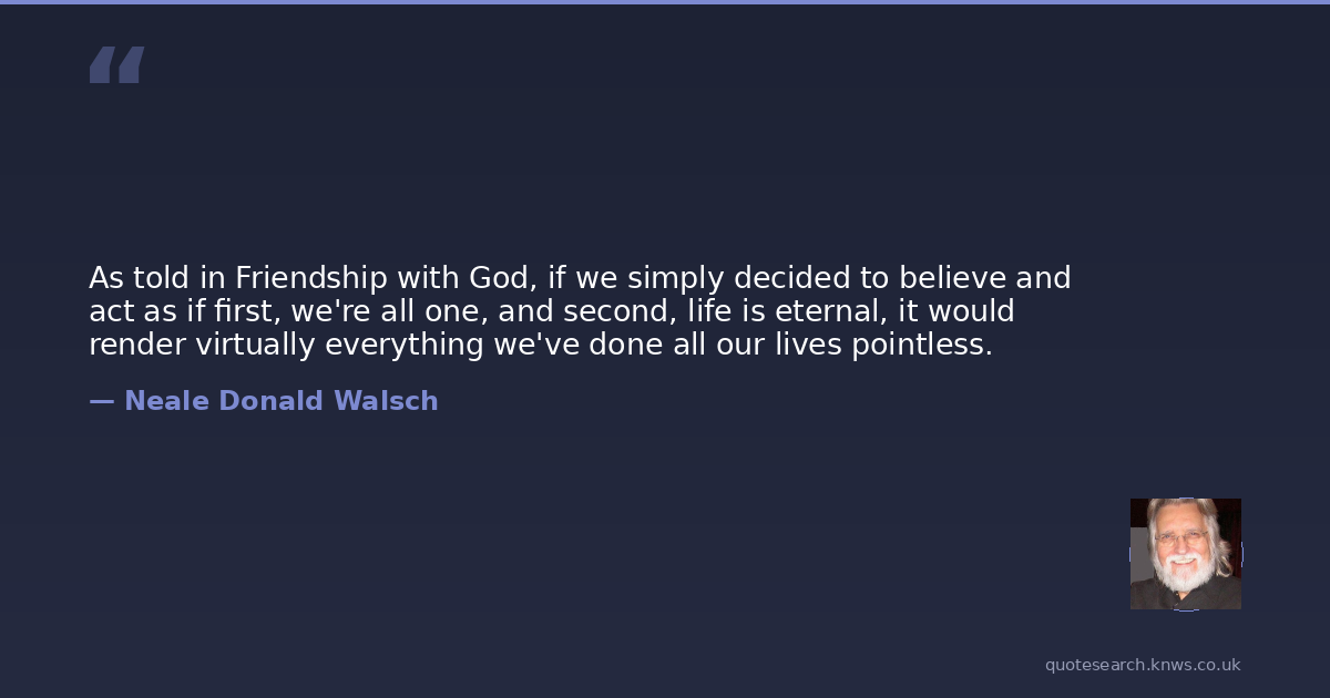 As told in Friendship with God, if we simply decided to believe and act as if first, we're all one, and second, life is eternal, it would render virtually everything we've done all our lives pointless.