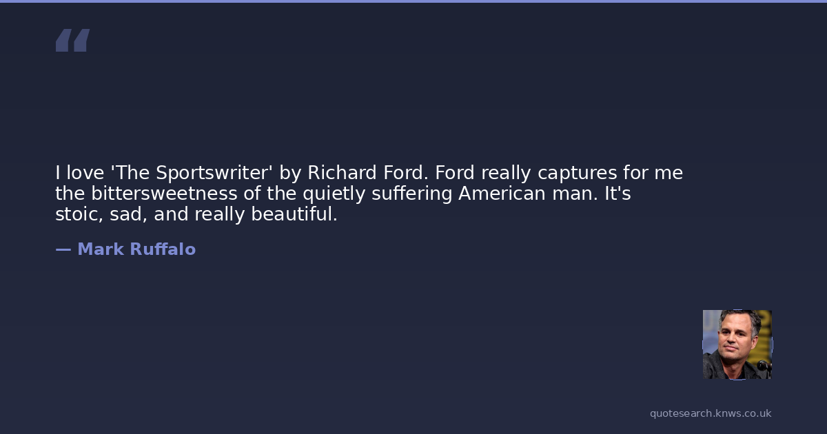 I love 'The Sportswriter' by Richard Ford. Ford really captures for me the bittersweetness of the quietly suffering American man. It's stoic, sad, and really beautiful.