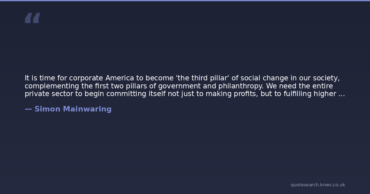 It is time for corporate America to become 'the third pillar' of social change in our society, complementing the first two pillars of government and philanthropy. We need the entire private sector to begin committing itself not just to making profits, but to fulfilling higher and larger purposes by contributing to building a better world.