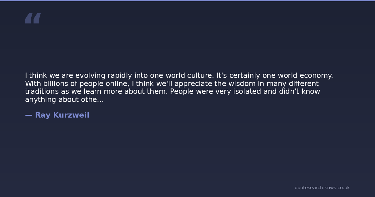I think we are evolving rapidly into one world culture. It's certainly one world economy. With billions of people online, I think we'll appreciate the wisdom in many different traditions as we learn more about them. People were very isolated and didn't know anything about other religions 100 years ago.