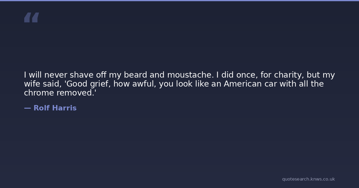 I will never shave off my beard and moustache. I did once, for charity, but my wife said, 'Good grief, how awful, you look like an American car with all the chrome removed.'
