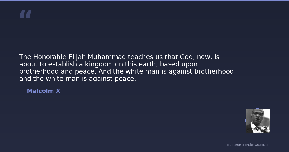 The Honorable Elijah Muhammad teaches us that God, now, is about to establish a kingdom on this earth, based upon brotherhood and peace. And the white man is against brotherhood, and the white man is against peace.