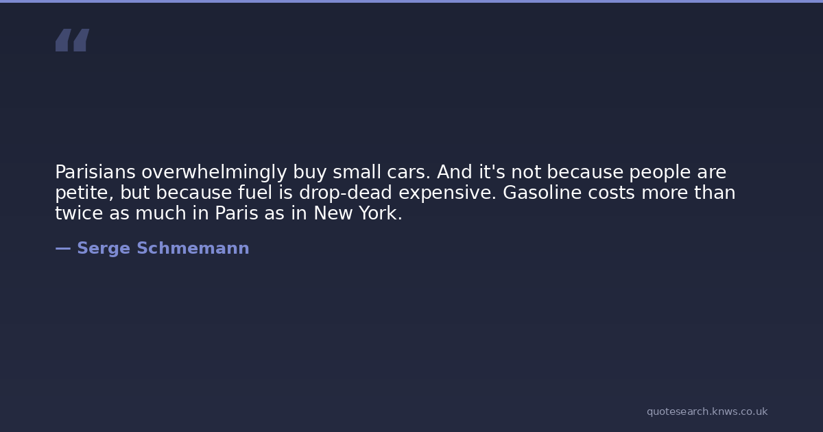 Parisians overwhelmingly buy small cars. And it's not because people are petite, but because fuel is drop-dead expensive. Gasoline costs more than twice as much in Paris as in New York.