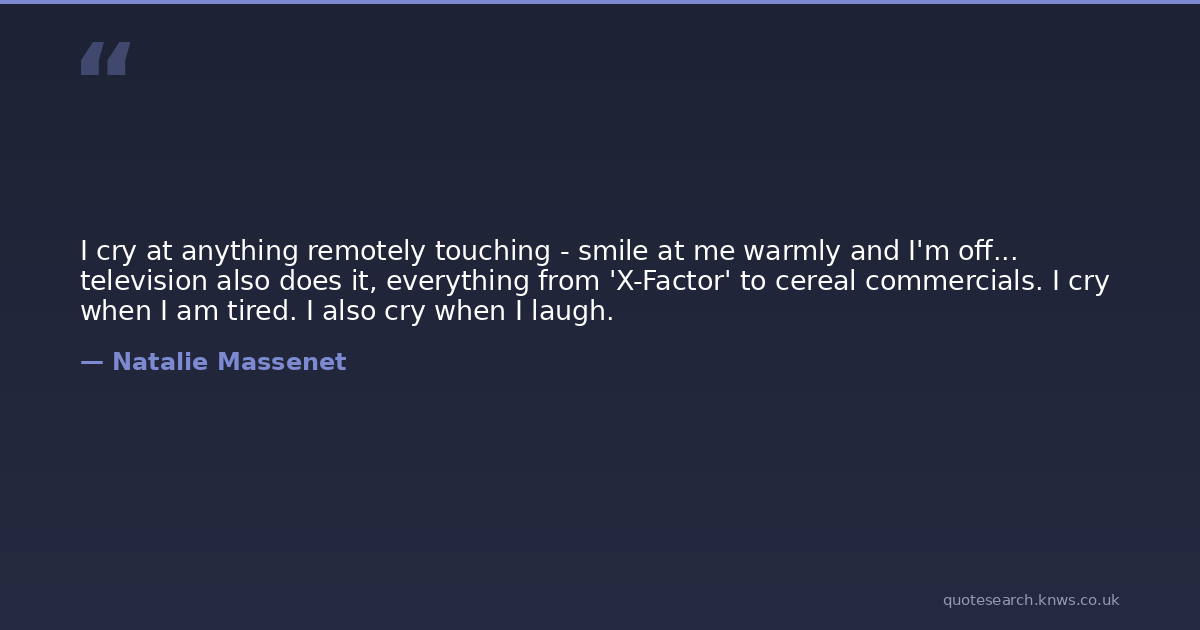 I cry at anything remotely touching - smile at me warmly and I'm off... television also does it, everything from 'X-Factor' to cereal commercials. I cry when I am tired. I also cry when I laugh.