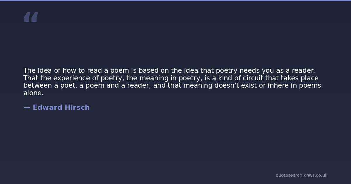 Edward Hirsch was a contemporary American poet and critic. Edward M. Hirsch is an American poet and critic who wrote a national bestseller about reading poetry. Read more on Wikipedia →