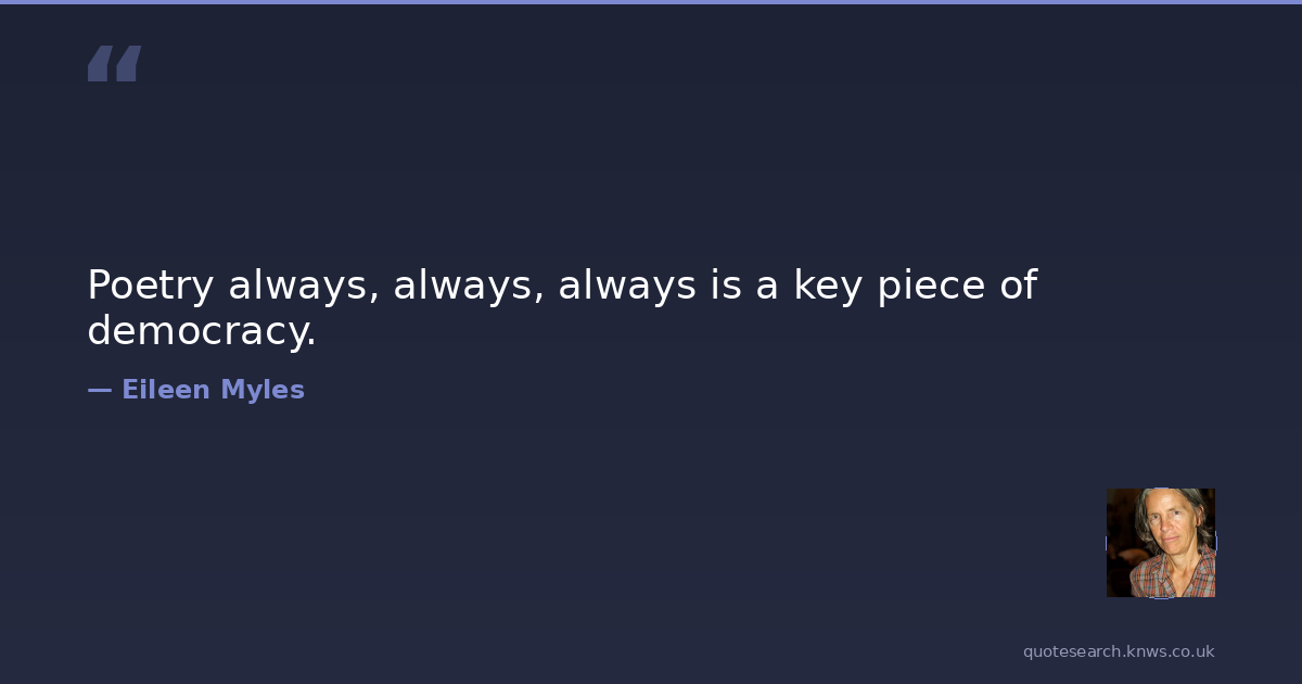 Eileen Myles was a contemporary American writer of poetry, fiction, and non-fiction. Eileen Myles is an American poet and writer who has produced more than twenty volumes of poetry, fiction, non-fiction, libretti, plays, and performance pieces over the last three decades. Novelist Dennis Cooper has described Myles as "one of the savviest and most restless intellects in contemporary literature." The Boston Globe described them as "that rare creature, a rock star of poetry." They won the Lambda Literary Award for Lesbian Fiction in 2011 for their Inferno In 2012, Myles received a Guggenheim Fellowship to complete Afterglow, which gives both a real and fantastic account of a dog's life. Read more on Wikipedia →