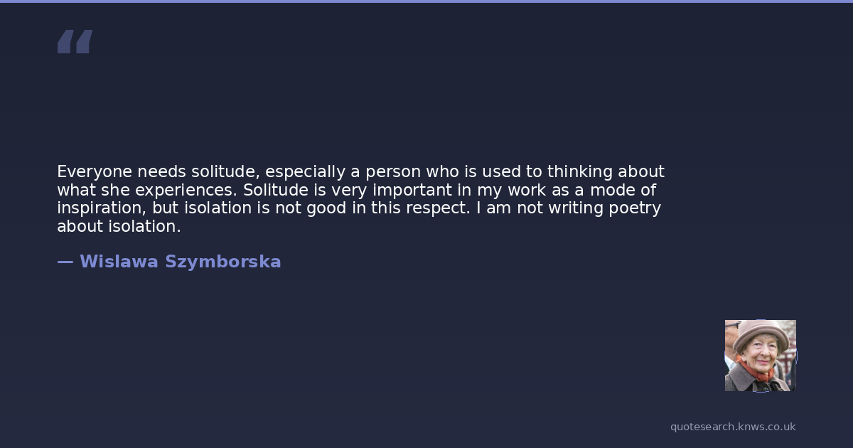 Everyone needs solitude, especially a person who is used to thinking about what she experiences. Solitude is very important in my work as a mode of inspiration, but isolation is not good in this respect. I am not writing poetry about isolation.
