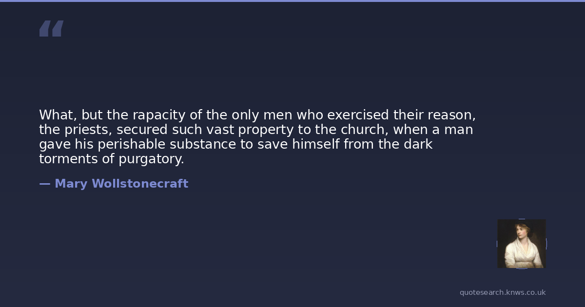 What, but the rapacity of the only men who exercised their reason, the priests, secured such vast property to the church, when a man gave his perishable substance to save himself from the dark torments of purgatory.