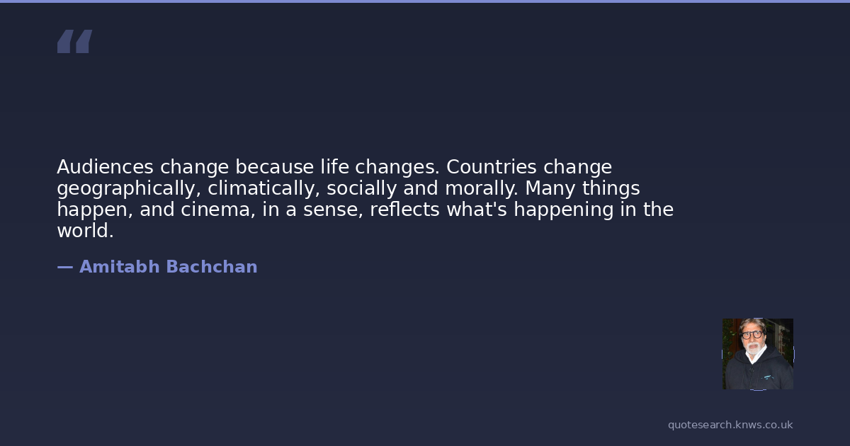 Audiences change because life changes. Countries change geographically, climatically, socially and morally. Many things happen, and cinema, in a sense, reflects what's happening in the world.