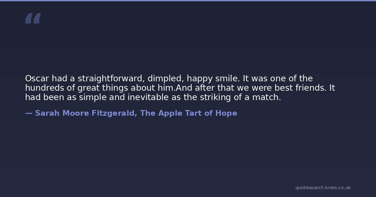 Oscar had a straightforward, dimpled, happy smile. It was one of the hundreds of great things about him.And after that we were best friends. It had been as simple and inevitable as the striking of a match.