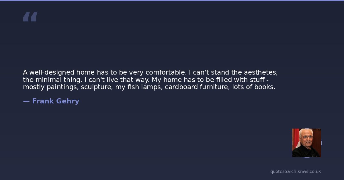 A well-designed home has to be very comfortable. I can't stand the aesthetes, the minimal thing. I can't live that way. My home has to be filled with stuff - mostly paintings, sculpture, my fish lamps, cardboard furniture, lots of books.