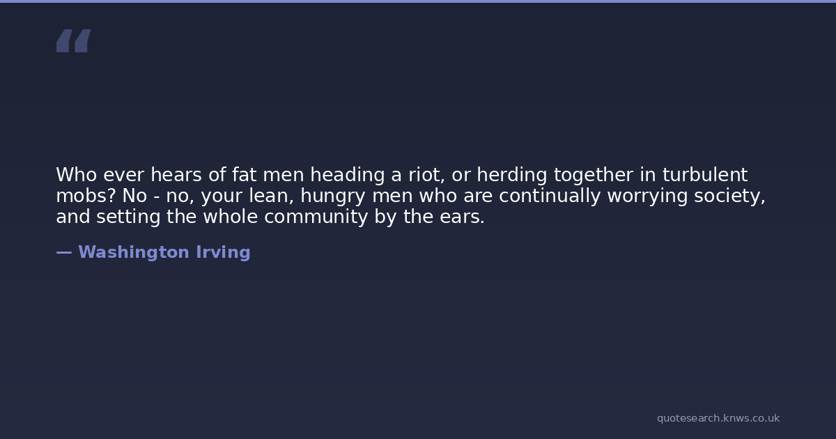 Who ever hears of fat men heading a riot, or herding together in turbulent mobs? No - no, your lean, hungry men who are continually worrying society, and setting the whole community by the ears.