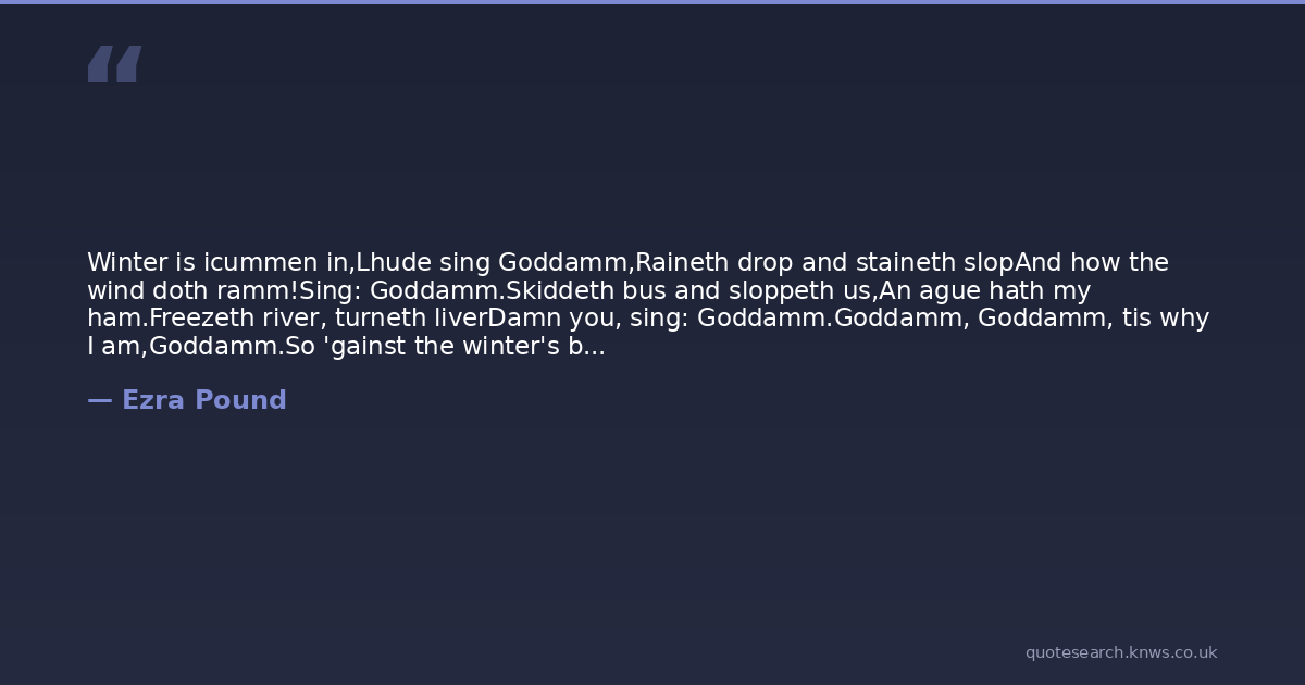Winter is icummen in,Lhude sing Goddamm,Raineth drop and staineth slopAnd how the wind doth ramm!Sing: Goddamm.Skiddeth bus and sloppeth us,An ague hath my ham.Freezeth river, turneth liverDamn you, sing: Goddamm.Goddamm, Goddamm, tis why I am,Goddamm.So 'gainst the winter's balmSing Goddamm, damm, sing GoddammSing Goddamm, sing Goddamm,DAMM.