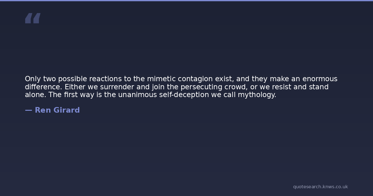 Only two possible reactions to the mimetic contagion exist, and they make an enormous difference. Either we surrender and join the persecuting crowd, or we resist and stand alone. The first way is the unanimous self-deception we call mythology.