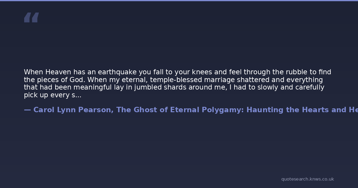 When Heaven has an earthquake you fall to your knees and feel through the rubble to find the pieces of God. When my eternal, temple-blessed marriage shattered and everything that had been meaningful lay in jumbled shards around me, I had to slowly and carefully pick up every single piece and examine it, turning it over and over, to see if it was worthy to keep and to use in building a new house of meaning. As I gathered the broken pieces of God, I used only my own authority, only my own relationship with the divine, and the good, small voice that speaks inside me, to appraise them. I threw away many, and I kept many, assembling the bright pieces into One Great Thought. I asked only, "Do I see God's fingerprints on this? Does this little piece feel godly? Does it speak of love?" That made it easy. I was forever finished with the insane attempt to love a God who hurts me. When I picked up the little pieces of God-ordained polygamy, I smiled because there was no question. I thanked the God of Love, and threw that piece away.