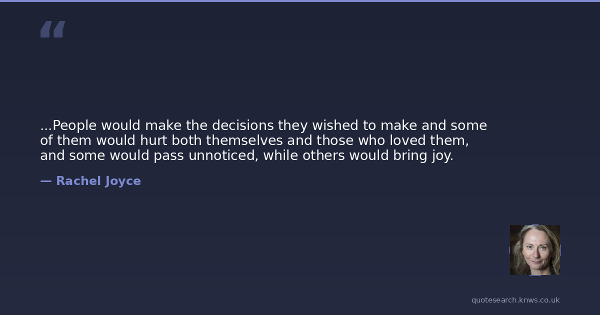 ...People would make the decisions they wished to make and some of them would hurt both themselves and those who loved them, and some would pass unnoticed, while others would bring joy.