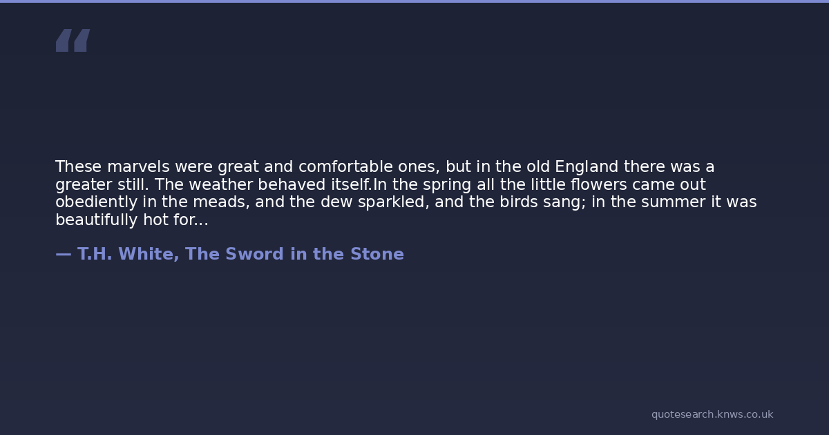 These marvels were great and comfortable ones, but in the old England there was a greater still. The weather behaved itself.In the spring all the little flowers came out obediently in the meads, and the dew sparkled, and the birds sang; in the summer it was beautifully hot for no less than four months, and, if it did rain just enough for agricultural purposes, they managed to arrange it so that it rained while you were in bed; in the autumn the leaves flamed and rattled before the west winds, tempering their sad adieu with glory; and in the winter, which was confined by statute to two months, the snow lay evenly, three feet thick, but never turned into slush.