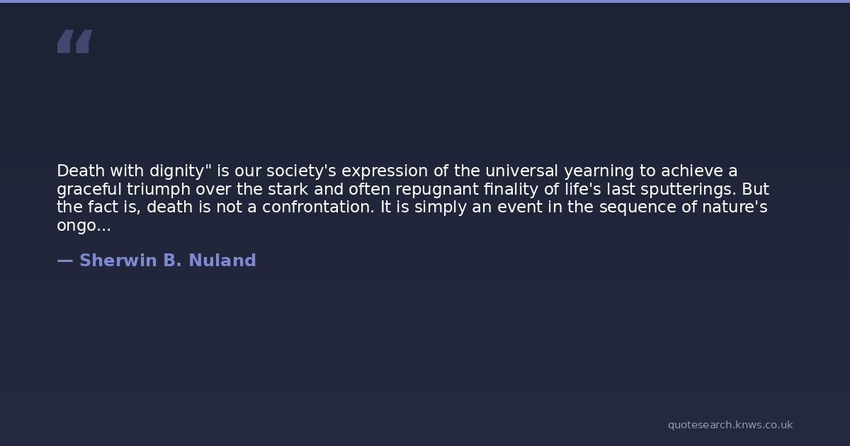 Death with dignity" is our society's expression of the universal yearning to achieve a graceful triumph over the stark and often repugnant finality of life's last sputterings. But the fact is, death is not a confrontation. It is simply an event in the sequence of nature's ongoing rhythms. Not death but disease is the real enemy, disease the malign force that requires confrontation. Death is the surcease that comes when the exhausting battle has been lost. Even the confrontation with disease should be approached with the realization that many of the sicknesses of our species are simply conveyances for the inexorable journey by which each of us is returned to the same state of physical, and perhaps spiritual, nonexistence from which we emerged at conception. Every triumph over some major pathology, no matter how ringing the victory, is only a reprieve from the inevitable end.