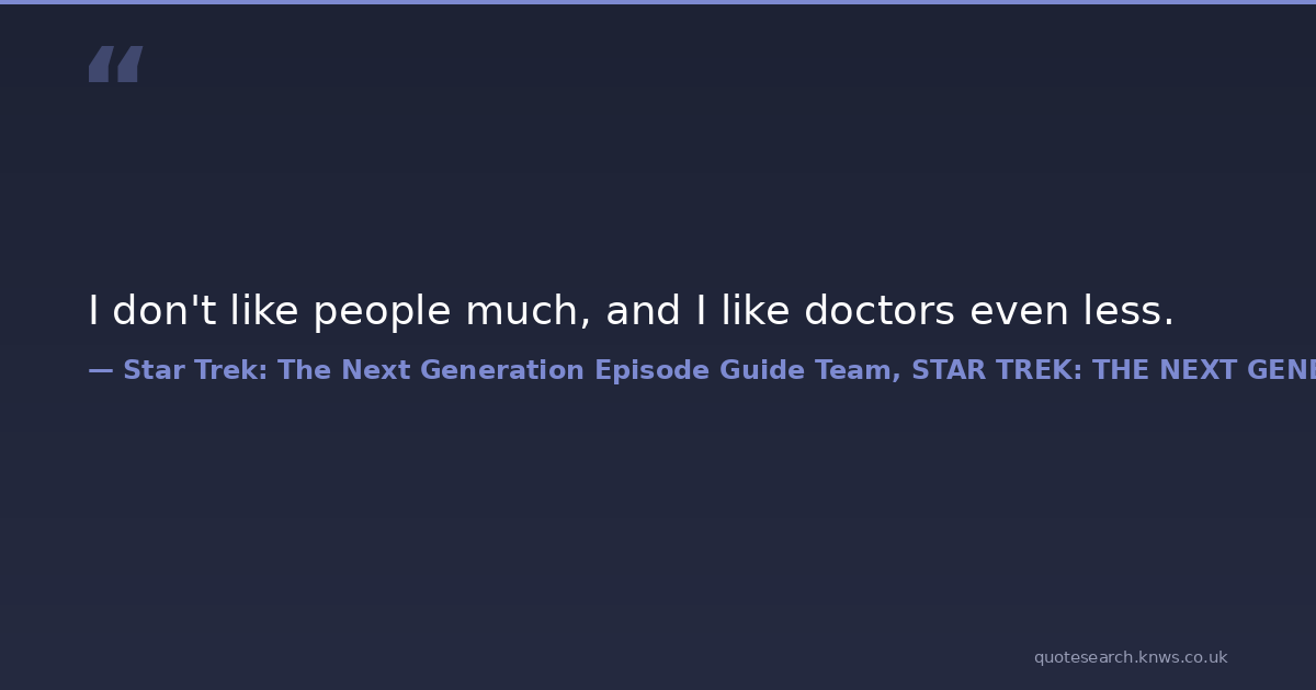 I don't like people much, and I like doctors even less. interpersonal-skills medicine physicians Download Image Share on X Share on Facebook Copy Link
