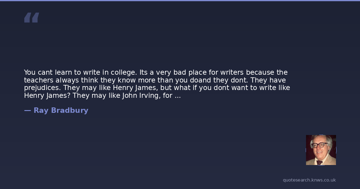 You cant learn to write in college. Its a very bad place for writers because the teachers always think they know more than you doand they dont. They have prejudices. They may like Henry James, but what if you dont want to write like Henry James? They may like John Irving, for instance, whos the bore of all time. A lot of the people whose work theyve taught in the schools for the last thirty years, I cant understand why people read them and why they are taught. The library, on the other hand, has no biases. The information is all there for you to interpret. You dont have someone telling you what to think. You discover it for yourself.