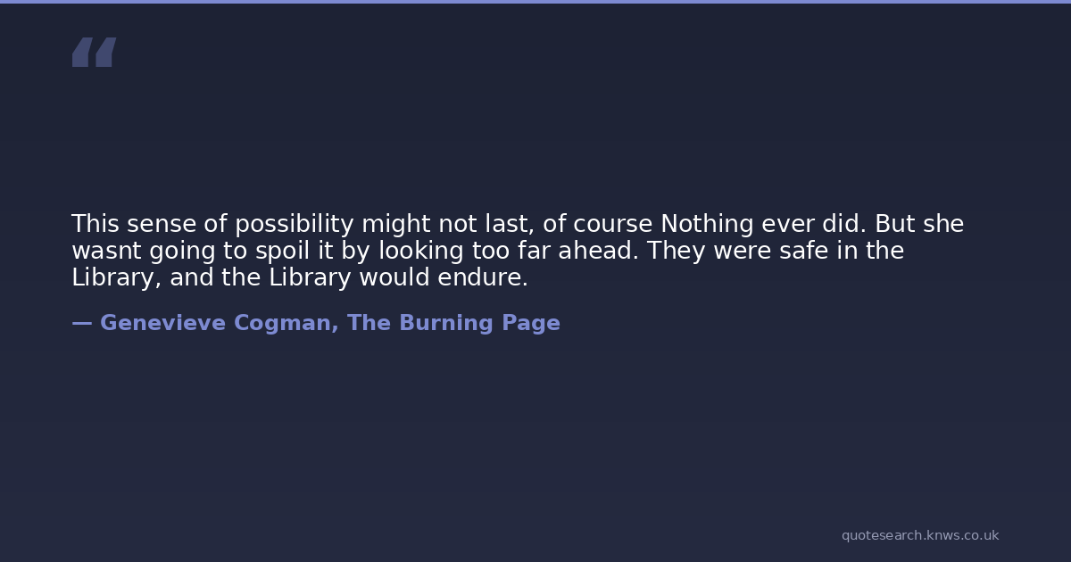 This sense of possibility might not last, of course Nothing ever did. But she wasnt going to spoil it by looking too far ahead. They were safe in the Library, and the Library would endure.