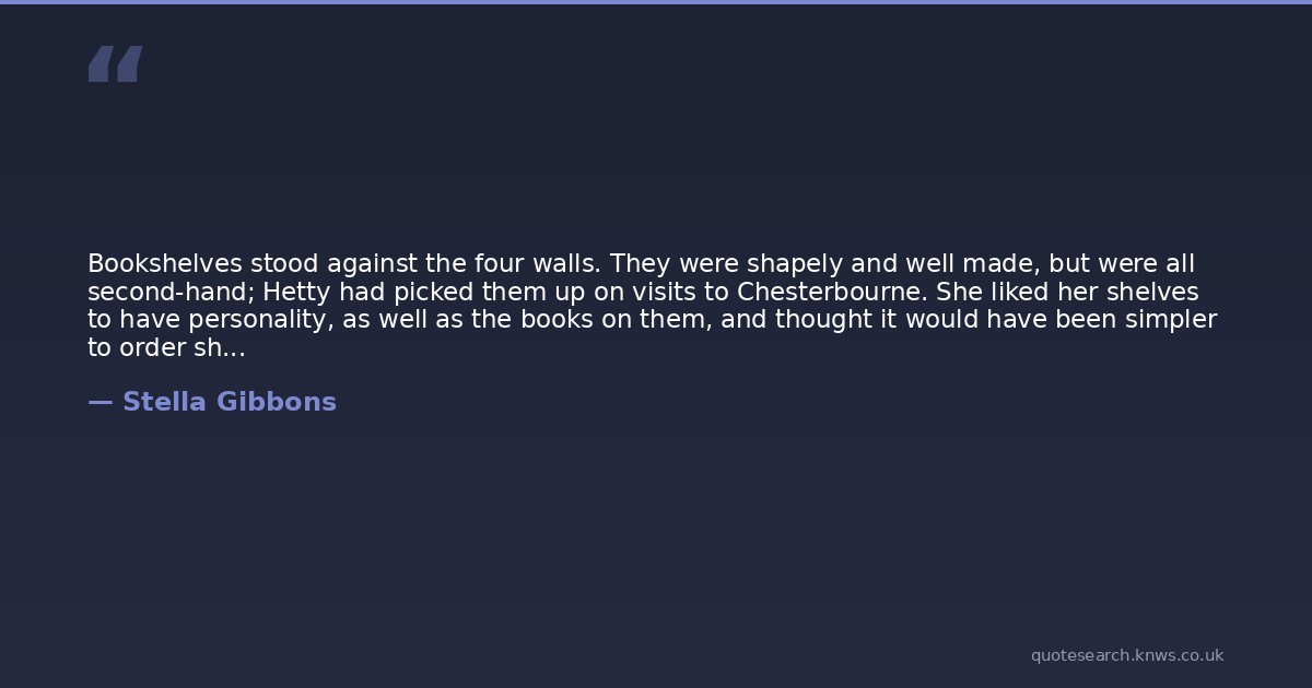 Bookshelves stood against the four walls. They were shapely and well made, but were all second-hand; Hetty had picked them up on visits to Chesterbourne. She liked her shelves to have personality, as well as the books on them, and thought it would have been simpler to order shelves to be fitted around the room, or to buy those bookcases that grow with the growth of their library, she had stood firm against the amusement of Victor and the irritation of her aunt, and had the shelves she wanted.