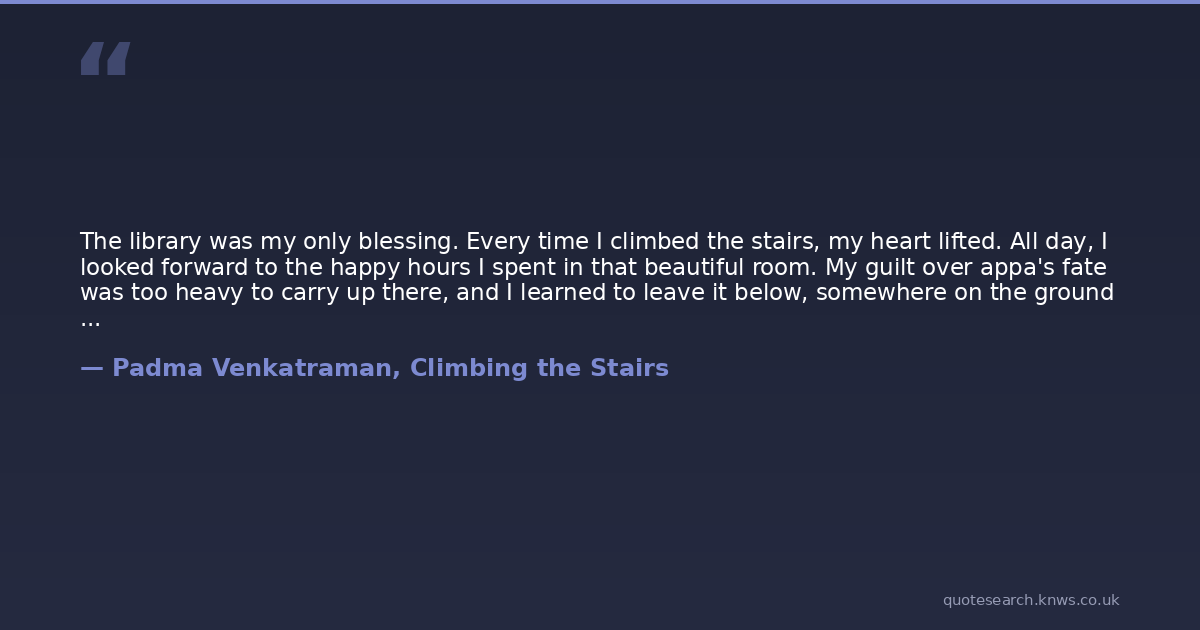The library was my only blessing. Every time I climbed the stairs, my heart lifted. All day, I looked forward to the happy hours I spent in that beautiful room. My guilt over appa's fate was too heavy to carry up there, and I learned to leave it below, somewhere on the ground floor. I left the house far behind as I walked on the path paved by the books, and every evening, baby Mangalam slept soundly on the bed I made for her on the window seat.