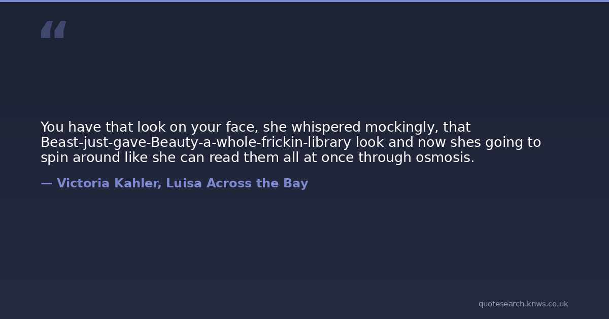 You have that look on your face, she whispered mockingly, that Beast-just-gave-Beauty-a-whole-frickin-library look and now shes going to spin around like she can read them all at once through osmosis.