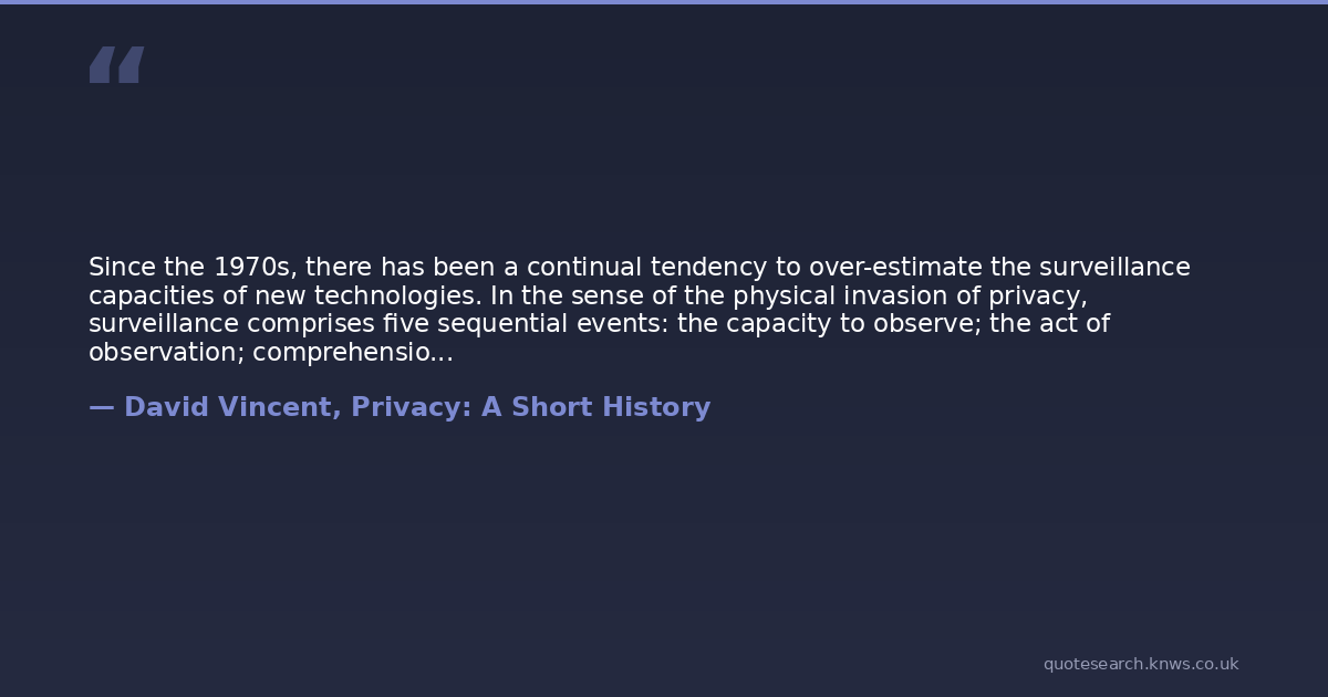 Since the 1970s, there has been a continual tendency to over-estimate the surveillance capacities of new technologies. In the sense of the physical invasion of privacy, surveillance comprises five sequential events: the capacity to observe; the act of observation; comprehension of what is seen; intervention on the basis of that knowledge; and a consequent change of behaviour by the subject. Too often the final four have been assumed from the possibility of the first.