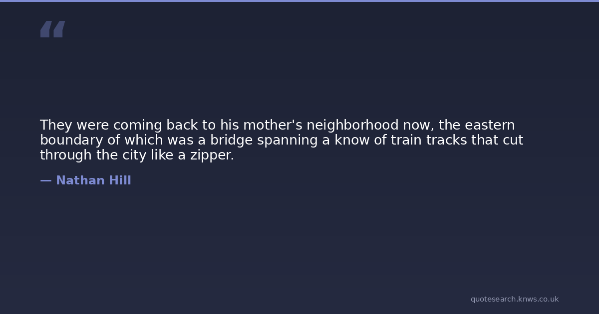They were coming back to his mother's neighborhood now, the eastern boundary of which was a bridge spanning a know of train tracks that cut through the city like a zipper.