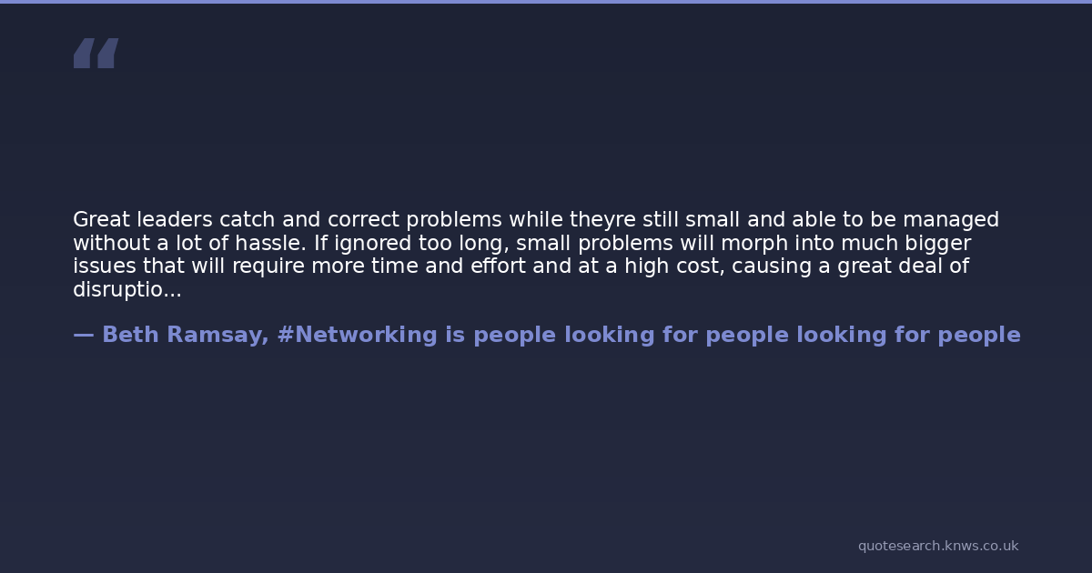 Great leaders catch and correct problems while theyre still small and able to be managed without a lot of hassle. If ignored too long, small problems will morph into much bigger issues that will require more time and effort and at a high cost, causing a great deal of disruption and stress.