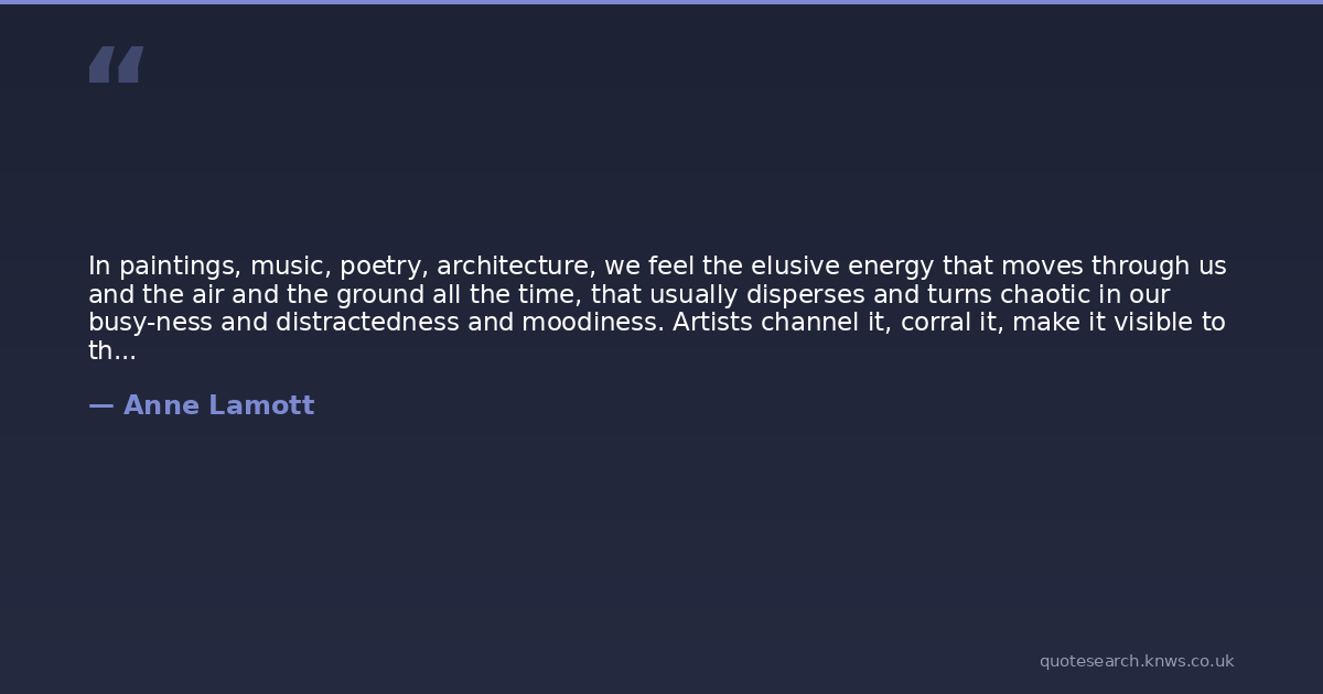 In paintings, music, poetry, architecture, we feel the elusive energy that moves through us and the air and the ground all the time, that usually disperses and turns chaotic in our busy-ness and distractedness and moodiness. Artists channel it, corral it, make it visible to the rest of us. The best works of art are like semaphores of our experience, signaling what we didn't know was true but do now.