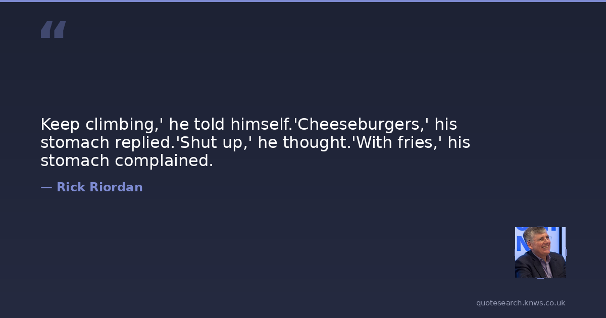 Keep climbing,' he told himself.'Cheeseburgers,' his stomach replied.'Shut up,' he thought.'With fries,' his stomach complained.